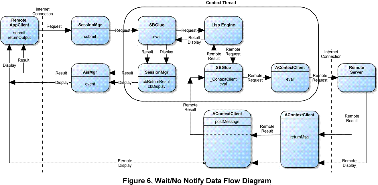 Wait/NoNotify. A simplified version of the above diagram is shown below for the wait/no notify case. SBGlue_ContextClient eval request generates a remote request and then falls into a wait loop. Display from the remote server is routed directly back to the remote client, iff a remote client generated the request. The result from the remote server is returned to waiting SBGlue_ContextClient eval function which then exits from the wait loop to return the result back to the Lisp Engine. Note that this context is not able to process any incoming requests while it is waiting for a return.