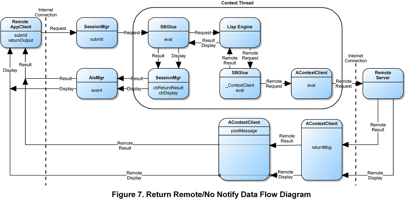 ReturnRemote/NoNotify. A simplified version of the Figure 5 is shown below for the return remote/no notify case. SBGlue_ContextClient eval request generates a remote request and then returns immediately. Display from the remote server is routed directly back to the remote client. Later, the result from the remote server is also returned back to the waiting client. The local context is unaware of the returned result.